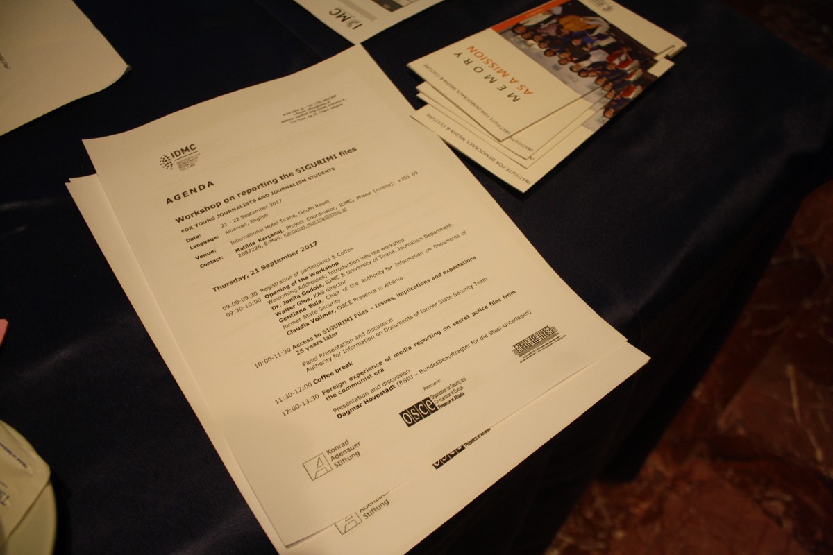 Instituti për Demokraci, Media dhe Kulturë (IDMC) në bashkëpunim me Autoritetin për Informimin mbi Dokumentet e ish-Sigurimit të Shtetit, Prezencën e OSBE-së në Shqipëri dhe Fondacionin Konrad Adenauer organizuan në datat 21‒22 shtator workshop-in "Raportimi mbi dosjet e Sigurimit".